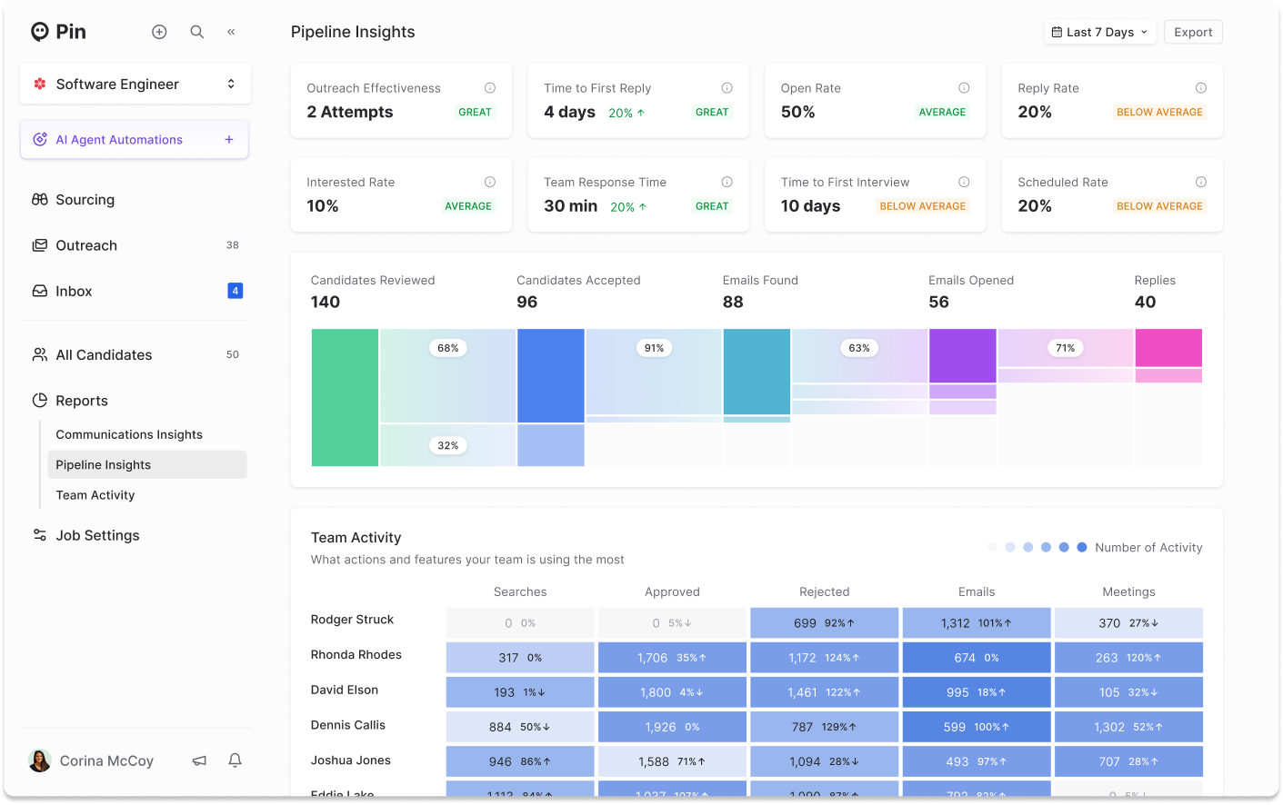We updated the Pipeline Insights so you can see pipeline health and outreach performance at a glance. Your core conversion metrics, outreach stats, and team activity are now all in one view.