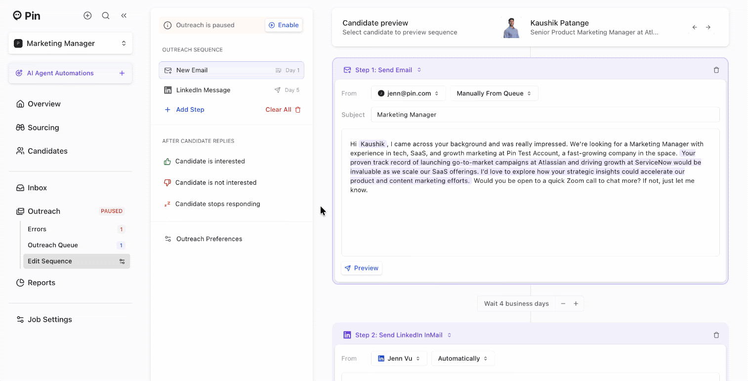 We refreshed the Outreach view so you can easily edit sequence steps and preview the exact message each candidate will receive.