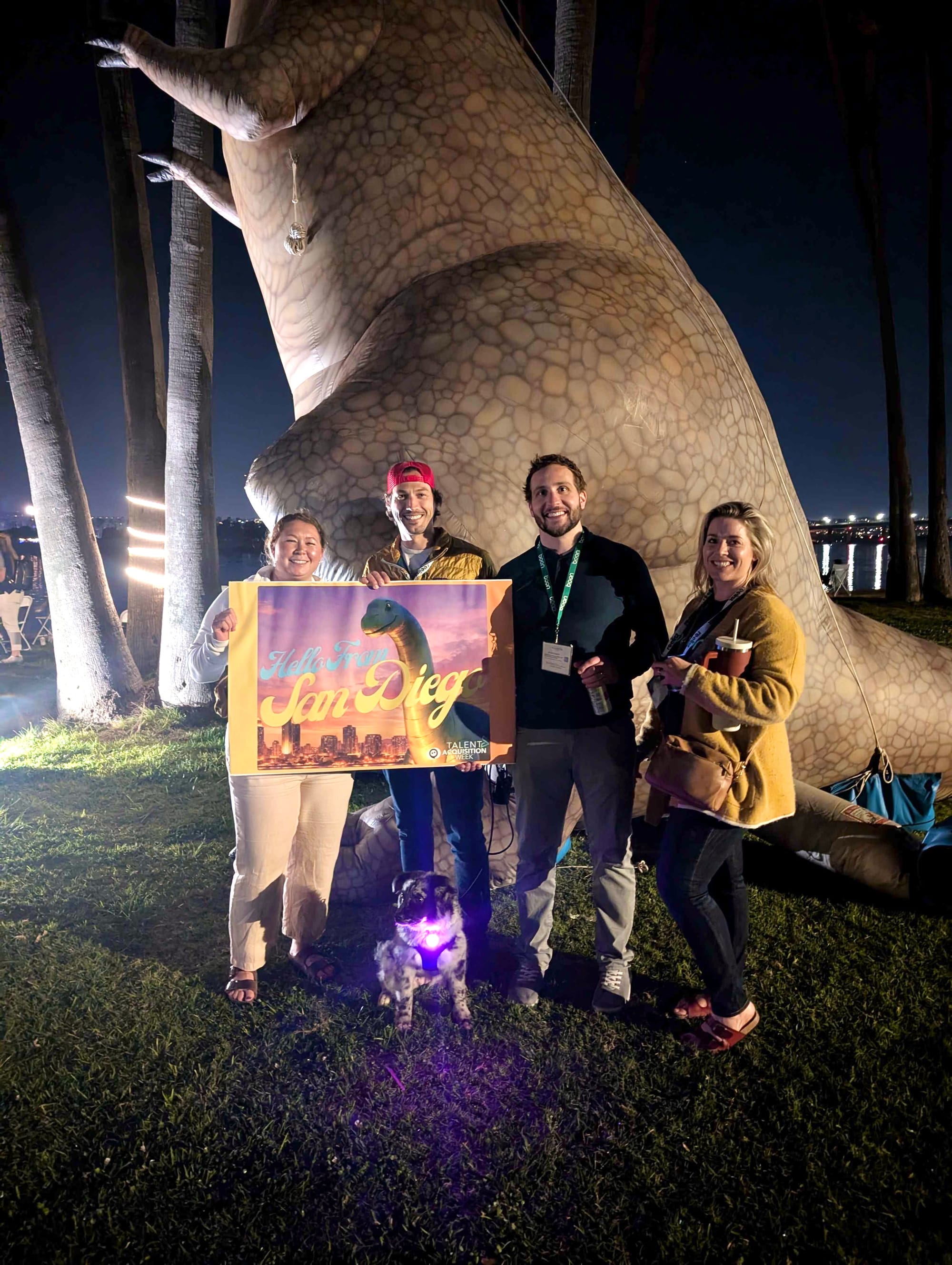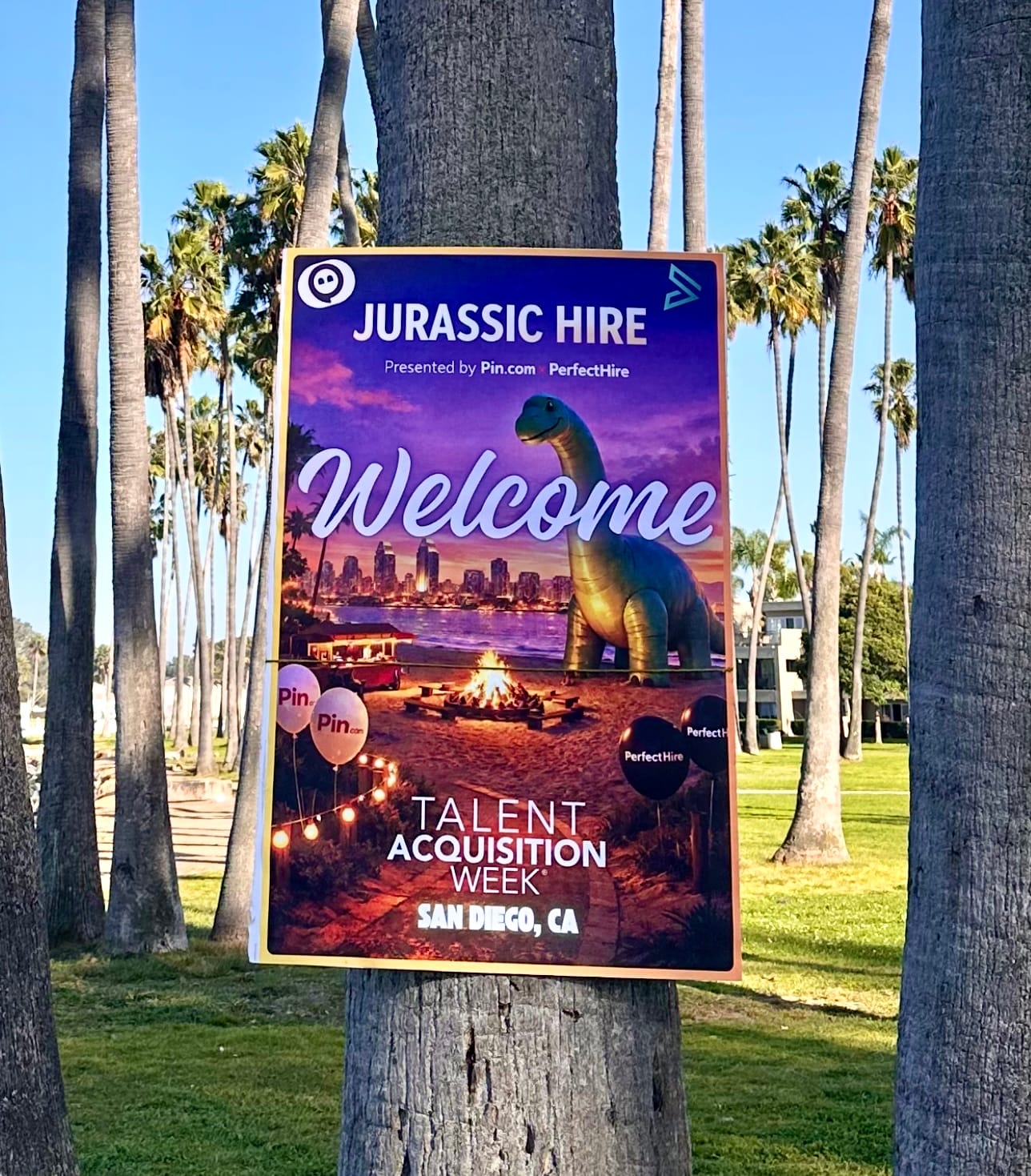 The Pin crew attended Talent Acquisition Week in San Diego and connected with the TA community—capping it off by hosting a beach party featuring a 60ft inflatable dinosaur with Perfect Hire and Evan White from Purple Acorn.